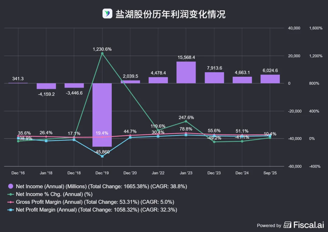 2024年,盐湖股份实现归属于上市公司股东的净利润46.63亿元,同比下降41.07%;归属于上市公司股东的扣除非经常性损益的净利润44.01亿元,同比下降49.56%。2025年三季报,盐湖股份实现归属于上市公司股东的净利润45.03亿元,同比增长43.34%;归属于上市公司股东的扣除非经常性损益的净利润44.94亿元,同比增长46.37%。