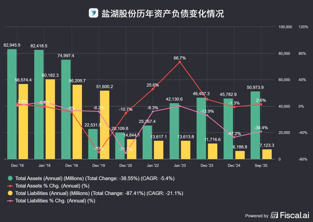 2024年,盐湖股份的总资产为457.83亿元,较上年同期下降1.35%;总负债为61.89亿元,较上年同期下降47.18%;2025年三季报,盐湖股份的总资产为509.74亿元,较上年同期增长2.64%;总负债为71.23亿元,较上年同期下降38.38%。