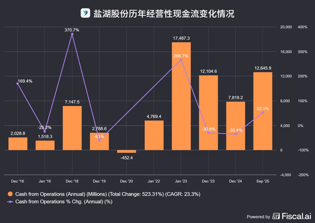 2024年,盐湖股份的经营性现金流为78.19亿元,较上年同期下降35.40%;2025年三季报,盐湖股份的经营性现金流为88.59亿元,较上年同期增长119.69%。
