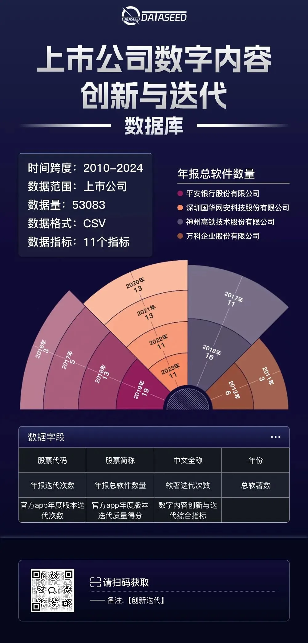 针对这一关键研究缺口,本团队精心构建《中国上市公司数字内容创新与迭代数据库》,依托年报披露、软件著作权登记及官方APP版本更新等多源信息,打造涵盖创新频率、创新质量与迭代效能的综合指标体系。该数据库不仅完整记录企业年度软件资产、软著迭代轨迹及APP版本演进细节,还通过标准化算法构建反映数字内容创新意愿、创新产出密度及迭代策略效能的核心量化指标,为剖析企业在数字转型中的微观创新行为提供精准数据支撑。