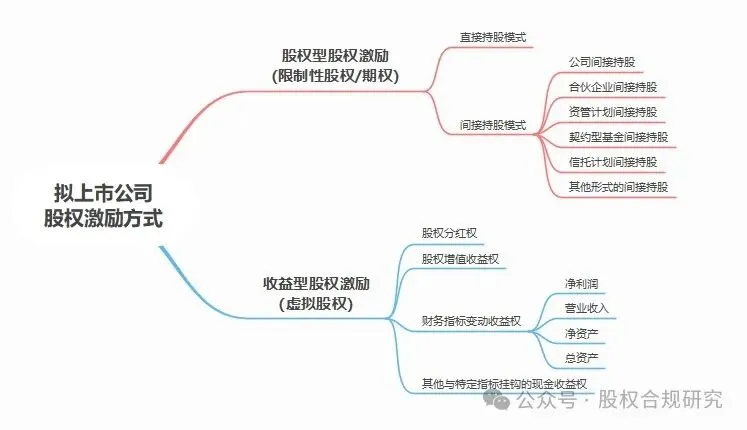 如前所述,拟上市公司在选择股权激励方式时,自由程度介于上市公司和无上市计划公司之间,结合我国法律法规及A股上市公司案例,拟上市公司采取的股权激励方式主要如下图所示: