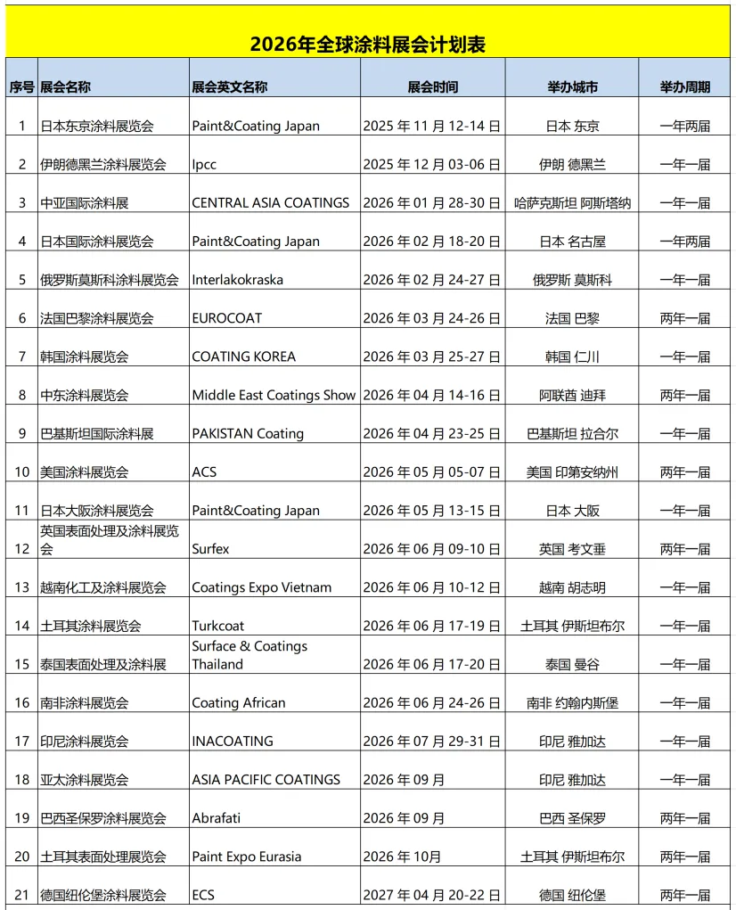 2026年全球涂料展会计划表