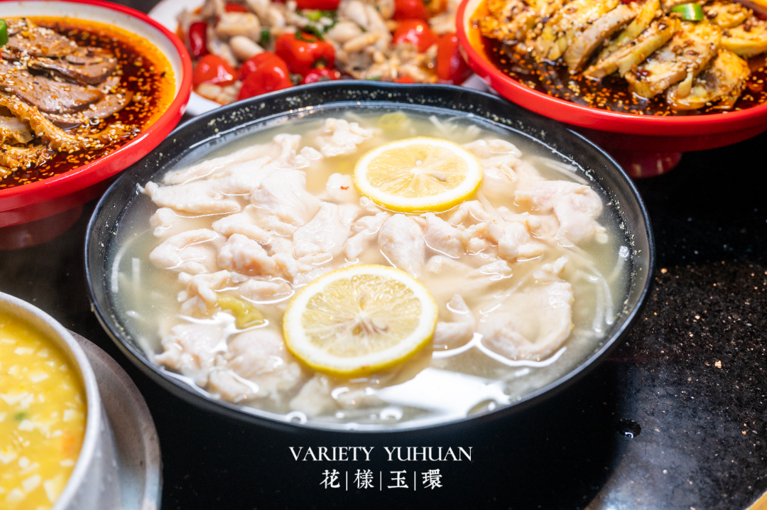 白嫩Q弹的秘制鸡片,清新的柠檬、酸爽的萝卜与秘制泡椒的碰撞刺激!清新的酸爽味,非常奇特。