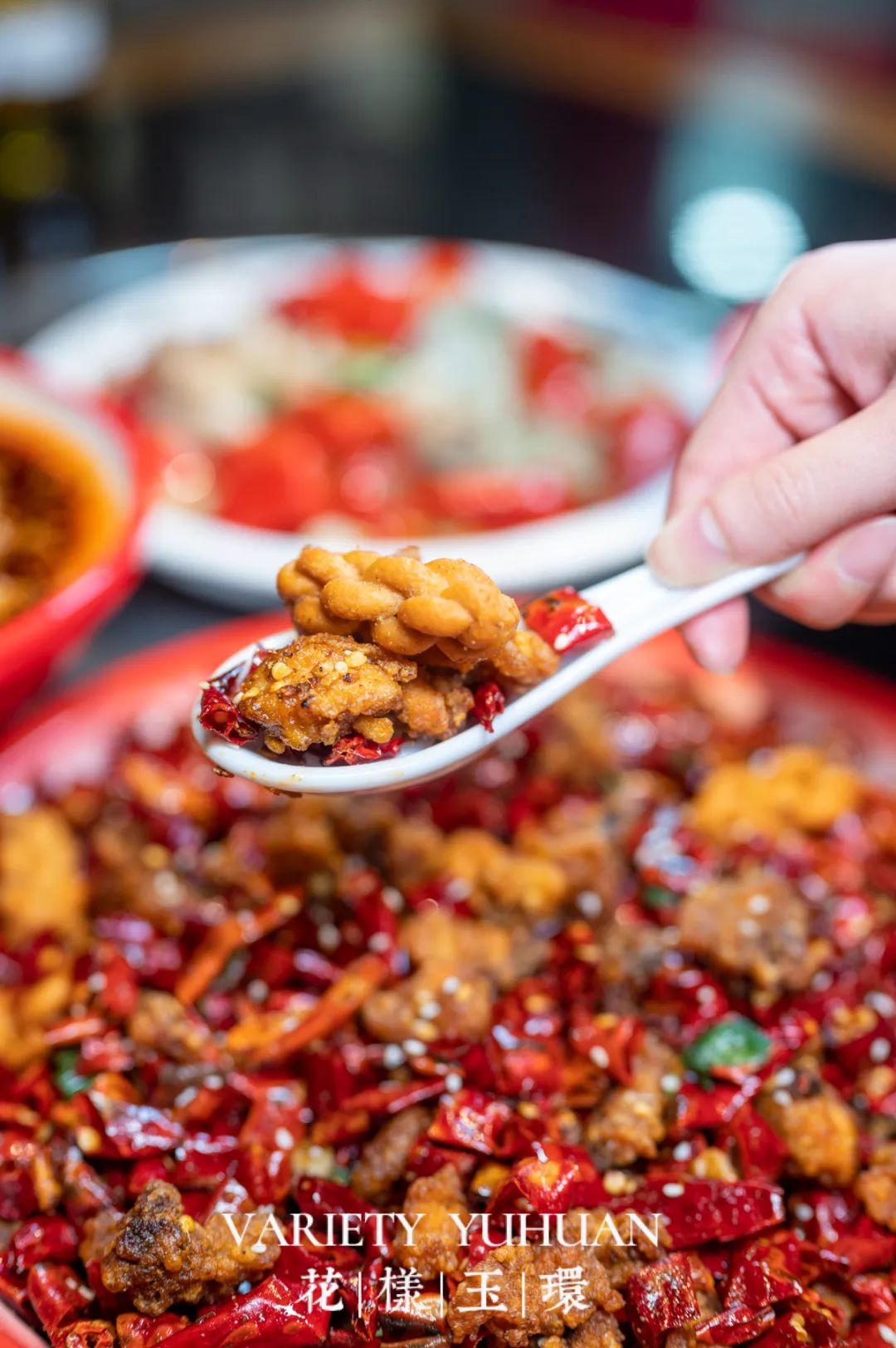 山城辣子鸡从气势上就能把你hold住,宽大的盘子盛起红红火火的一大份鸡肉丁!