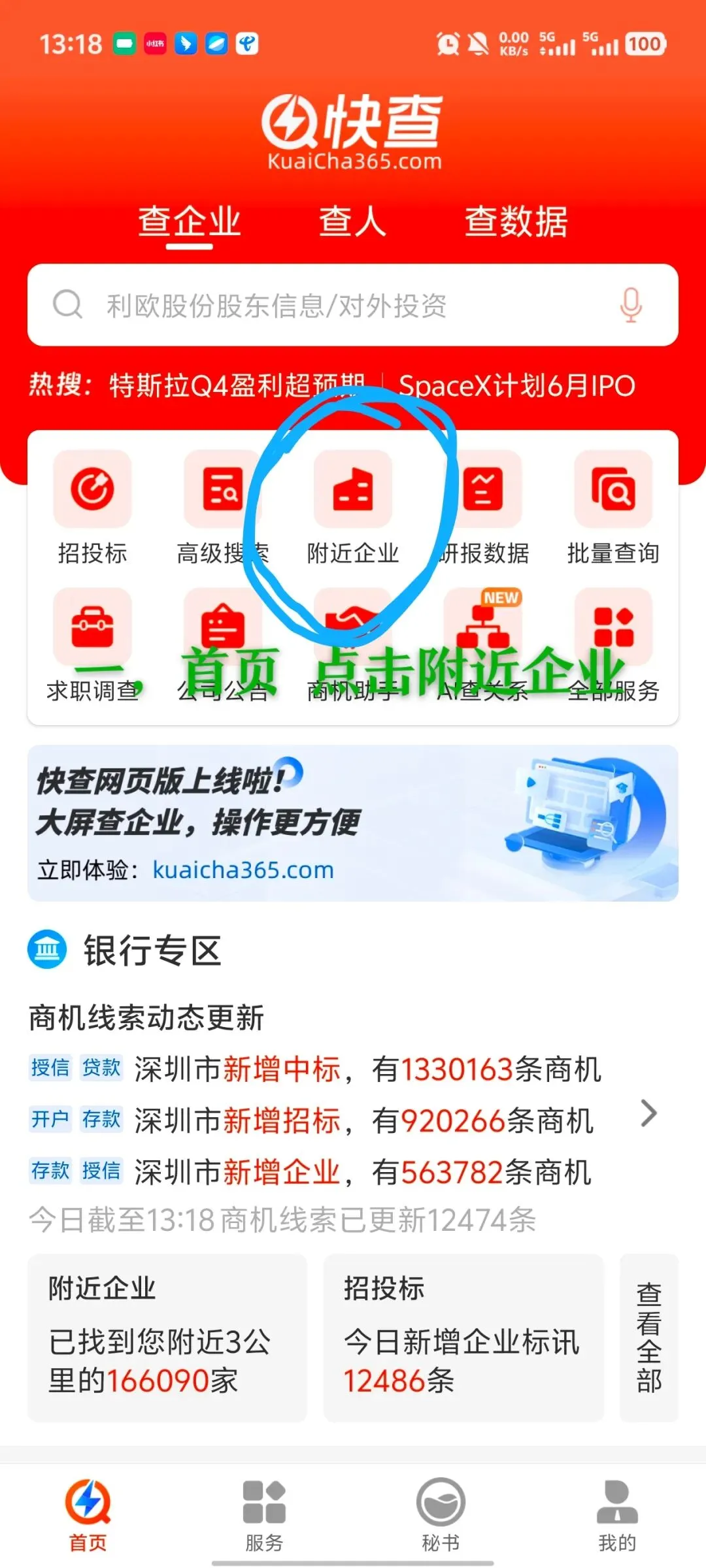 一,打开快查、首页界面就可以看到 附近企业 图标,点击进入