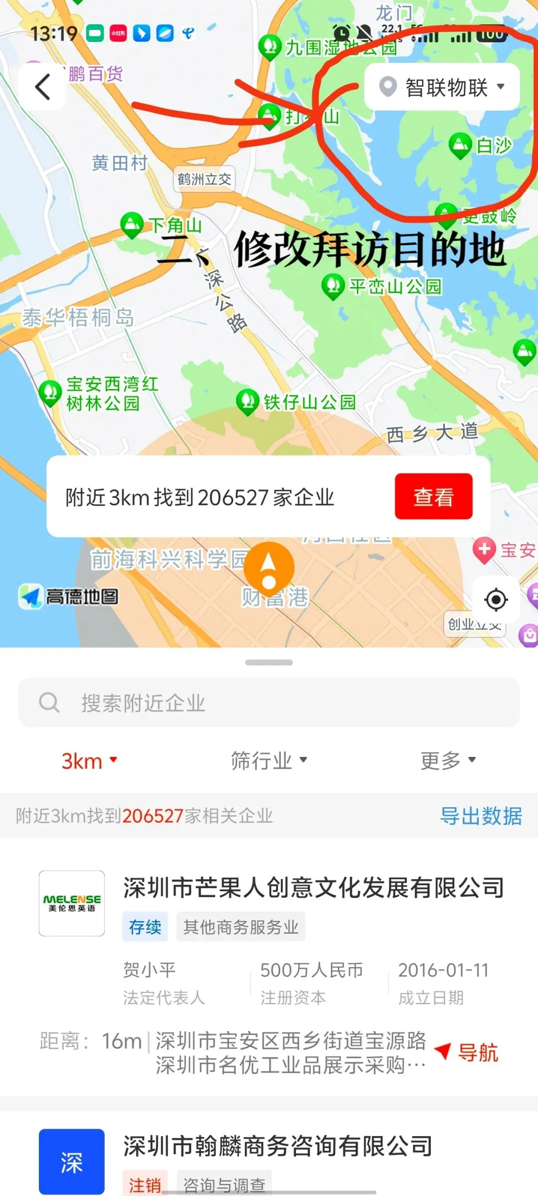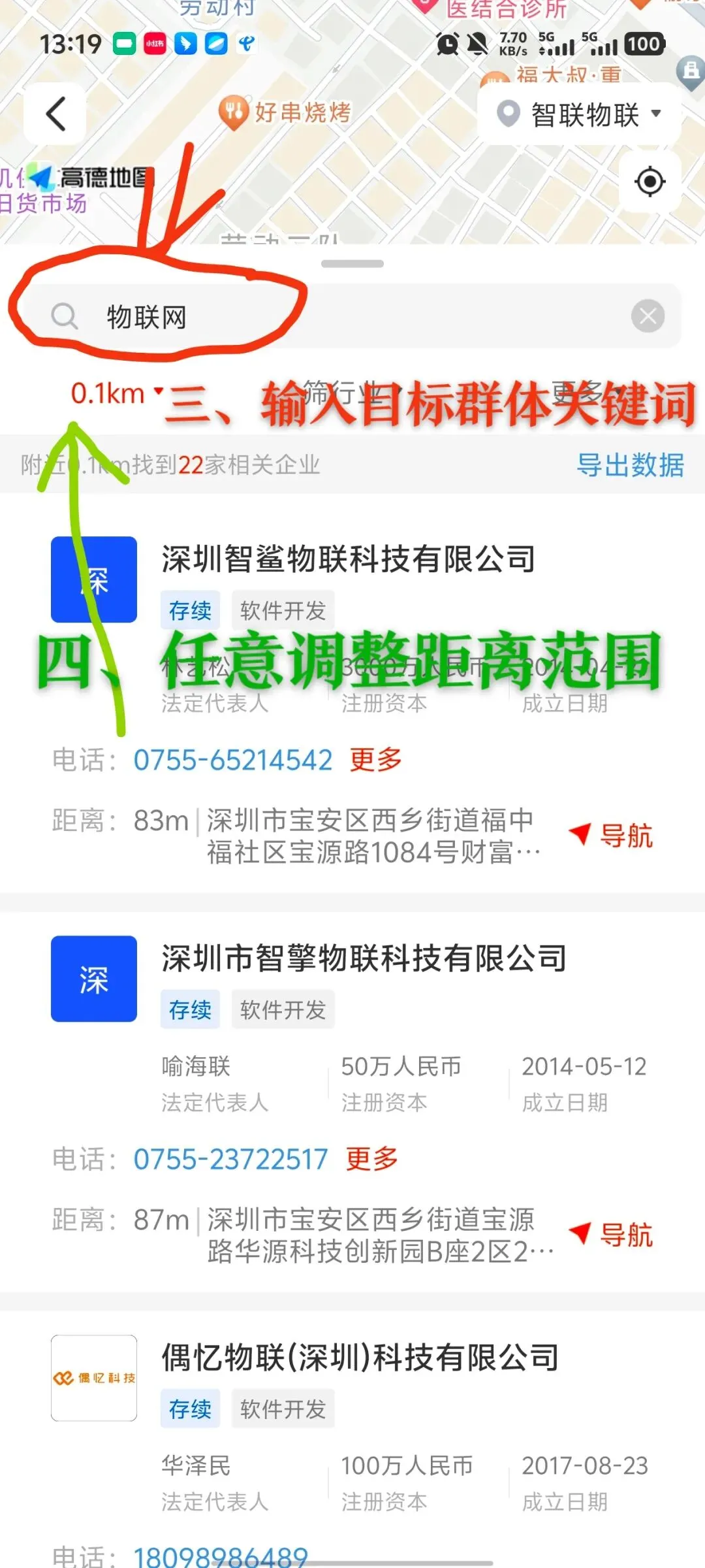 这个功能就非常棒了,你目标的产业园区如果跟你行业非常相关的,这个距离范围调整为100米,也能出来很多关联企业。
