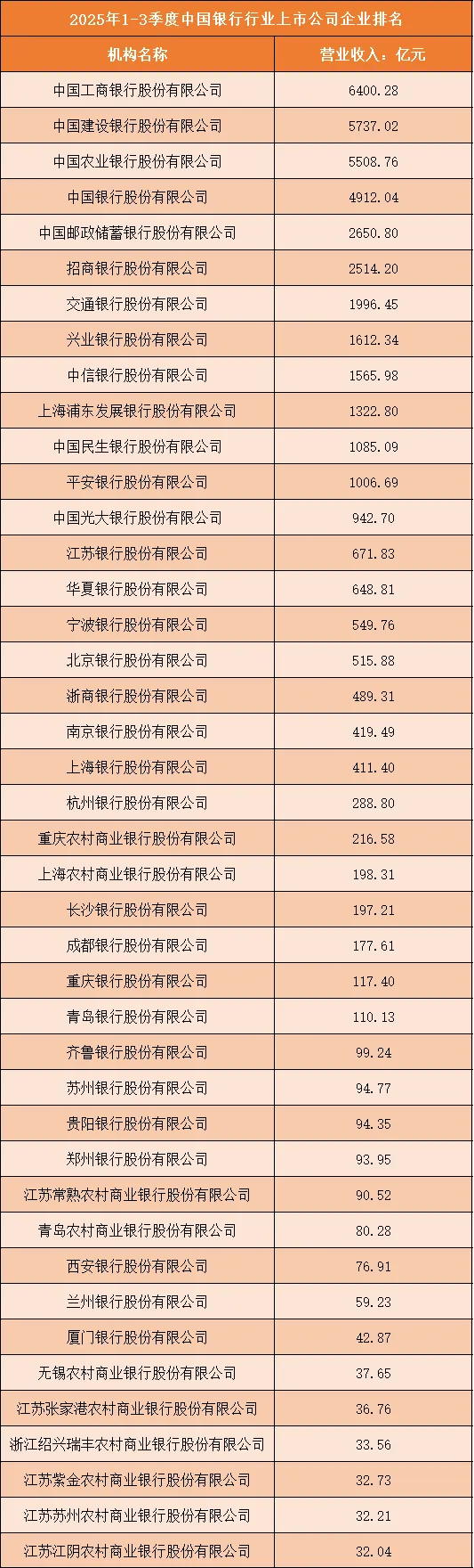 根据申万行业分类,2025年1-3季度中国银行行业上市公司按营业收入排名如下:(A股上市公司)