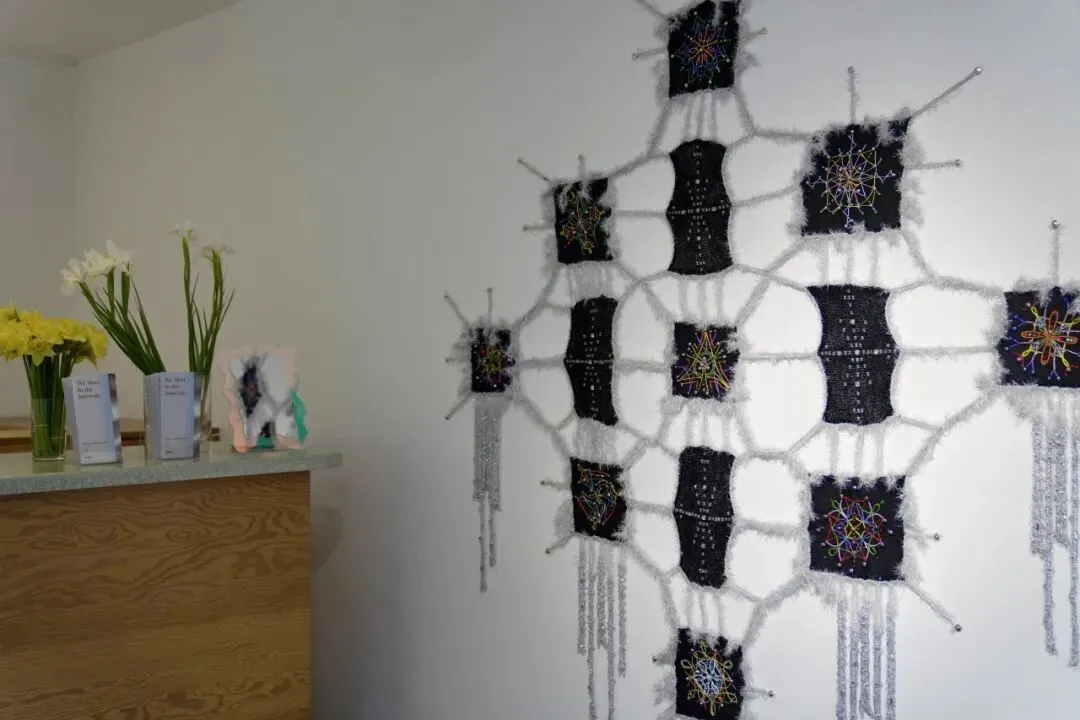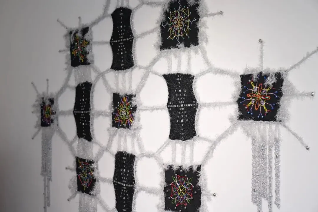 Shenlu Liu 的纺织作品以手工艺的方式描绘不可见之物。她在黑色织物上进行刺绣与珠饰,将水晶能量凝聚为十三个“符印”般的发光节点,并以银色纹理将它们连接成如同导管般的脉络。伴随流动的水与悬挂的铃声,作品将视觉地形转化为一个可共振的多感官场域,提出艺术品作为一种 सक्रिय的“水晶网络”,能够与观者产生和谐的能量回应。