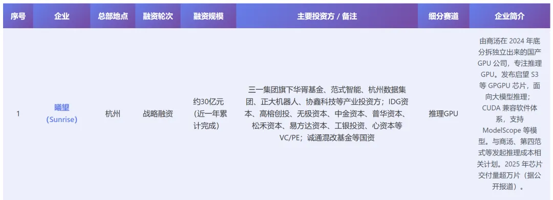 曦望(Sunrise)近一年累计完成约 30 亿元战略融资,专注推理 GPU,启望 S3 已发布,2025 年芯片交付量超万片;