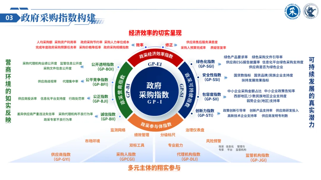 联合发布的中国政府采购指数,基于政府采购的基本原则与核心功能,通过政采营商环境分解指数、经济效率分解指数以及涵盖绿色子指数、包容子指数、安全子指数、创新子指数的可持续发展分解指数,分别从营商环境的优劣状态,经济效率的绩效表现,可持续发展的潜力水平,实现对政府采购进行完备科学评价。并通过对政府采购各类参与主体的指标关系映射,组合构建政府采购各类参与主体(含采购人、供应商、代理机构与监管机构)指数。