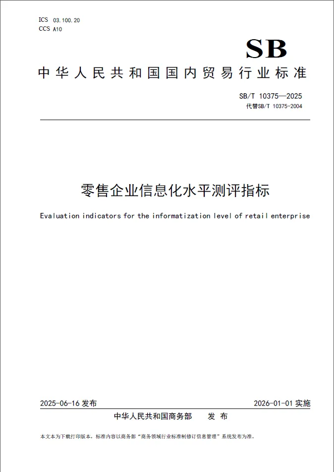 《零售企业信息化水平测评指标》行业标准SB/T 10375-2025是由中国商业联合会牵头,联合南方电网互联网服务有限公司 、多点生活(中国)网络科技有限公司 、上海海鼎信息工程股份有限公司 、新消费(北京)规划院有限公司等头部企业共同修订完成。标准适用于指导零售企业、信息化技术服务商及第三方开展零售企业信息化水平的测评活动。