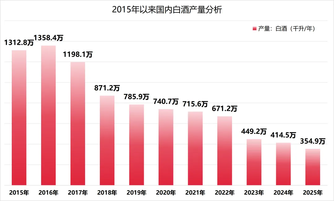 从数据趋势来看,国内白酒行业自2016年达到历史峰值1358.4万千升后,便呈现出由盛转衰的态势。具体而言,2018年白酒产量告别了千万级别,至2023年已跌破500万千升大关,而到了最近的2025年,产量更是不足2016年峰值时期的零头(358.4万千升)。