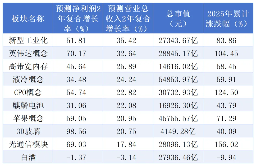 对于未来两年行业的营收增速预测,白酒行业的前景颇为黯淡。预计2026年和2027年的复合营收增速将为-3.14%,净利润的复合增速也将为负数,达到-1.37%。这表明未来两年白酒行业可能面临营收和利润双双下滑的态势。相比之下,新型工业化、英伟达概念、高带宽内存等板块则展现出利润和营收双位数增长的积极预期。