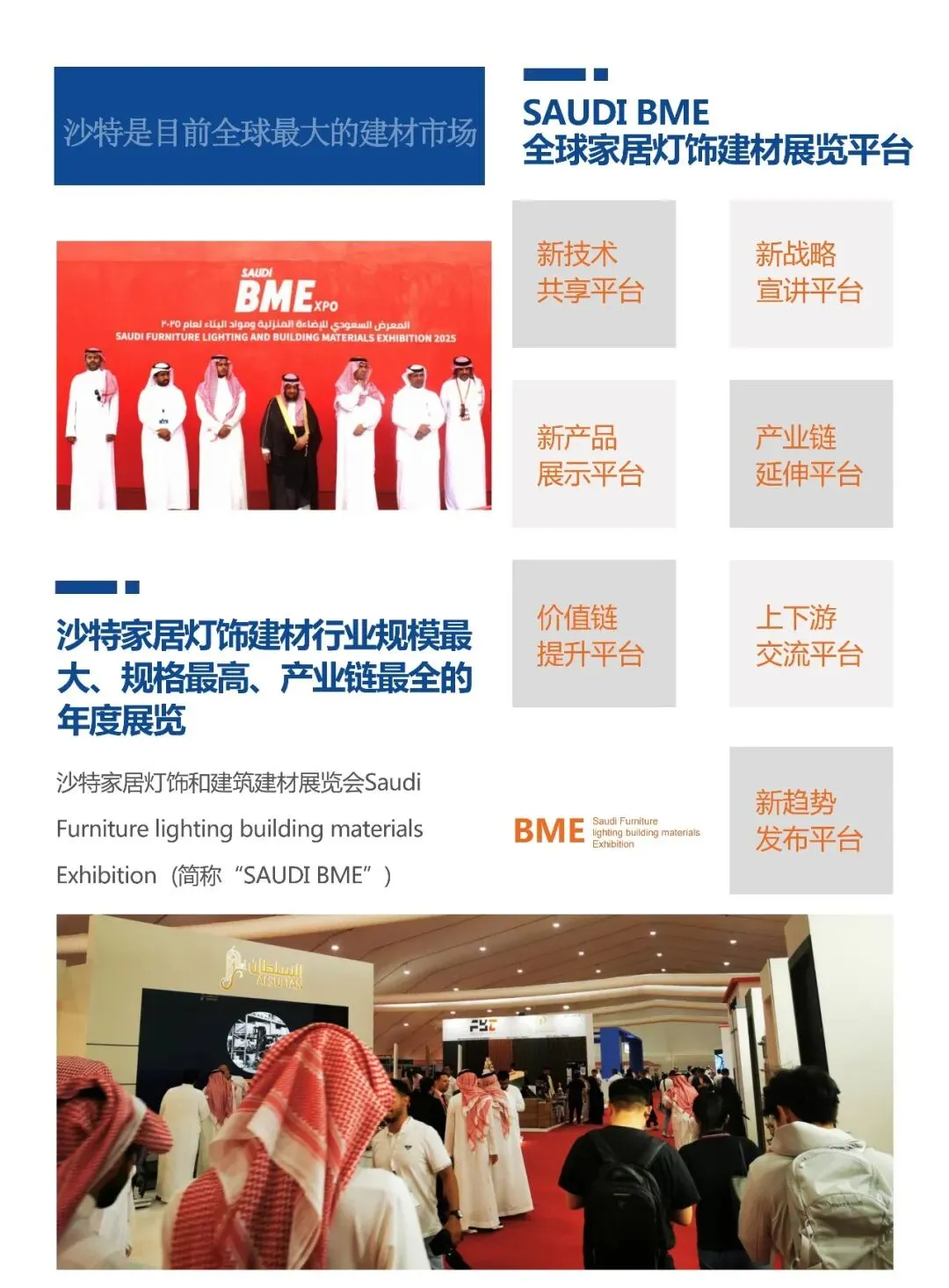 沙特BME建材展展专注于家居灯饰和建筑建材领域全产业链,相比big5综合性多个行业的展会,以及沙特build展会(虽聚焦建筑领域,但范畴相对宽泛),BME的专业性更强。