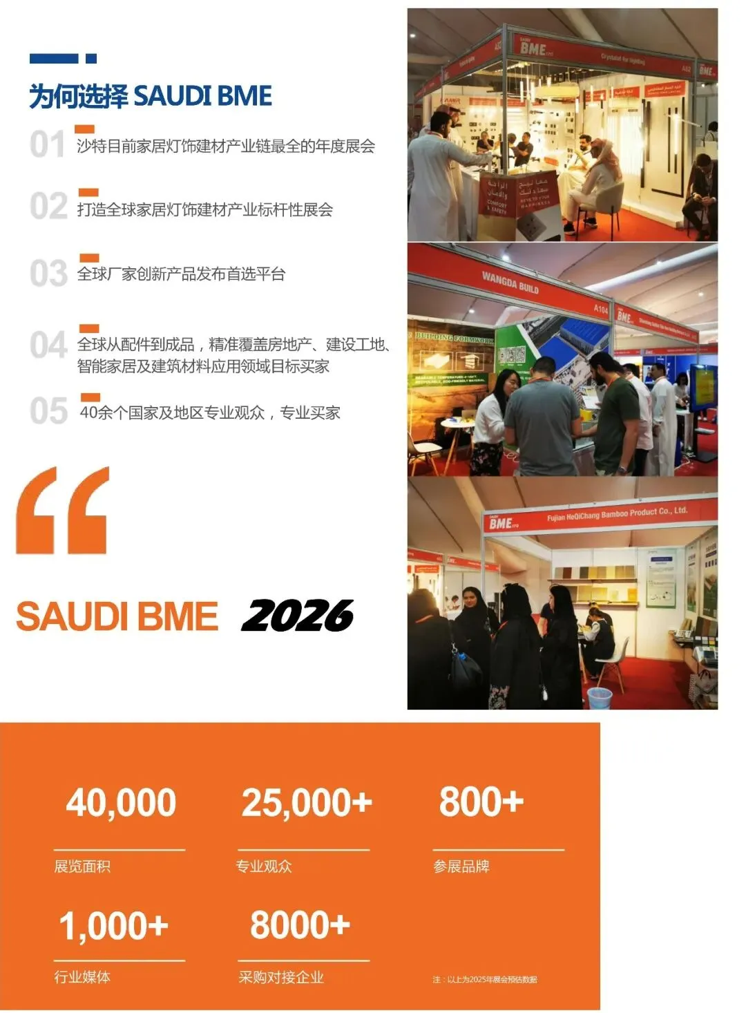 从规模上看,2025年,沙特BME建材展展览面积达1.5万平方米。而到2026年,预计展览面积扩大至4万平方米,展商突破千家,专业观众超4万。