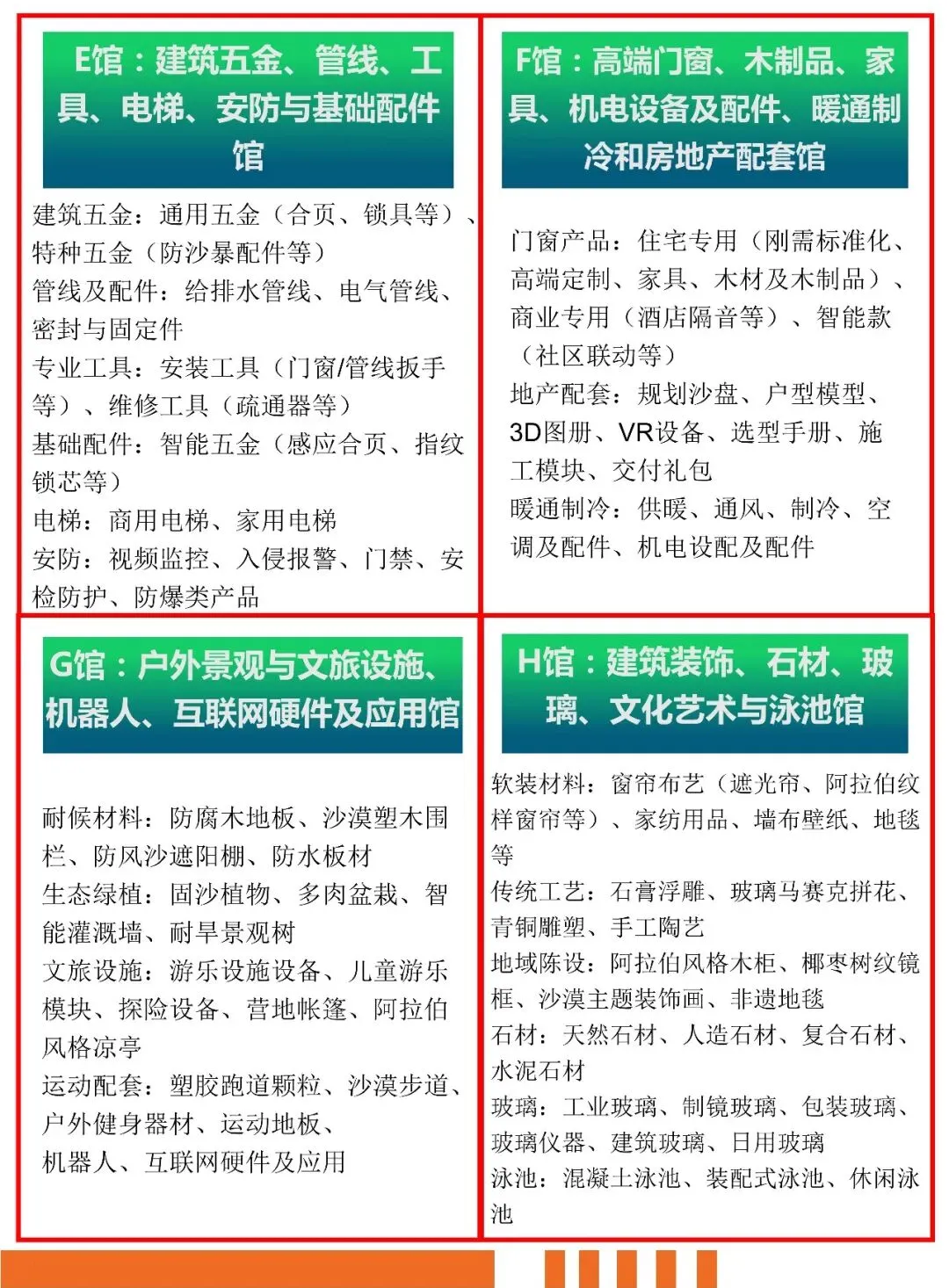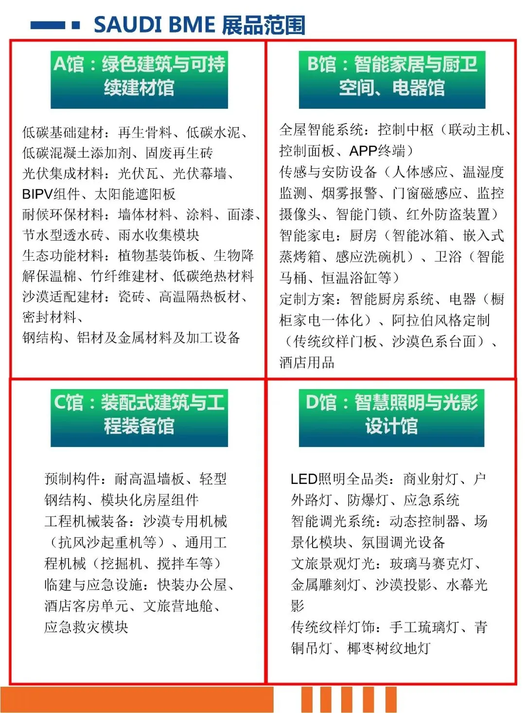 big5展会虽也在行业峰会上聚焦绿色建筑、智慧城市等前沿议题,但BME建材展会通过主题馆的形式,将这些前沿概念落地为实体展示,让观众能更直观感受行业趋势。而沙特build展会目前公开资料中,暂未体现出如此紧跟时代趋势的主题规划。