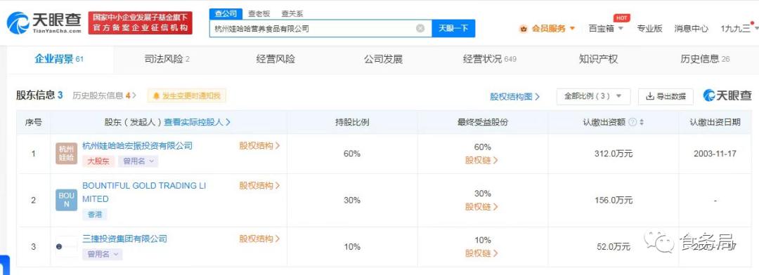 近日,杭州娃哈哈营养食品有限公司发生工商变更,宗庆后卸任法定代表人、总经理,新增曾哲泉为法定代表人、经理。目前,宗庆后仍任该公司董事长。该公司成立于2003年11月,注册资本520万美元,由杭州娃哈哈宏振投资有限公司、三捷投资集团有限公司、Bountiful gold trading limited共同持股。
