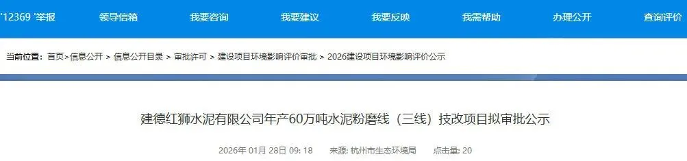 1月28日,浙江省杭州市生态环境局发布建德红狮水泥有限公司年产60万吨水泥粉磨线(三线)技改项目拟审批公示。