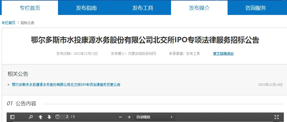 鄂尔多斯市水投康源水务股份有限公司(证券简称:康源水务 证券代码:873734 )发布鄂尔多斯市水投康源水务股份有限公司北交所IPO专项法律服务招标公告,公告显示,鄂尔多斯市水投康源水务股份有限公司北交所IPO专项法律服务已具备招标条件,开始招标,也就是说开启了北交所IPO之路。