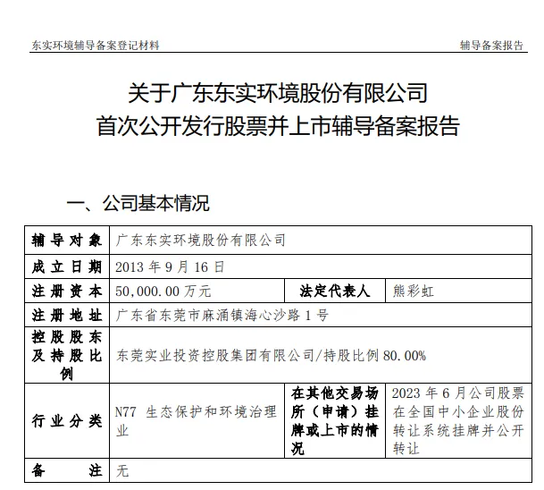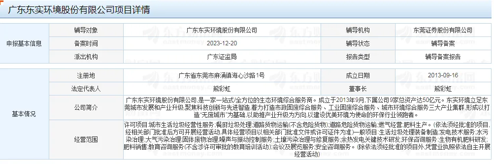 据辅导备案报告显示,东实环境于2023年12月15日向中国证券监督管理委员会广东监管局(以下简称“广东证监局”)报送了公司公开发行股票并在北京证券交易所(以下简称“北交所”)上市辅导备案申请材料,辅导机构为东莞证券。