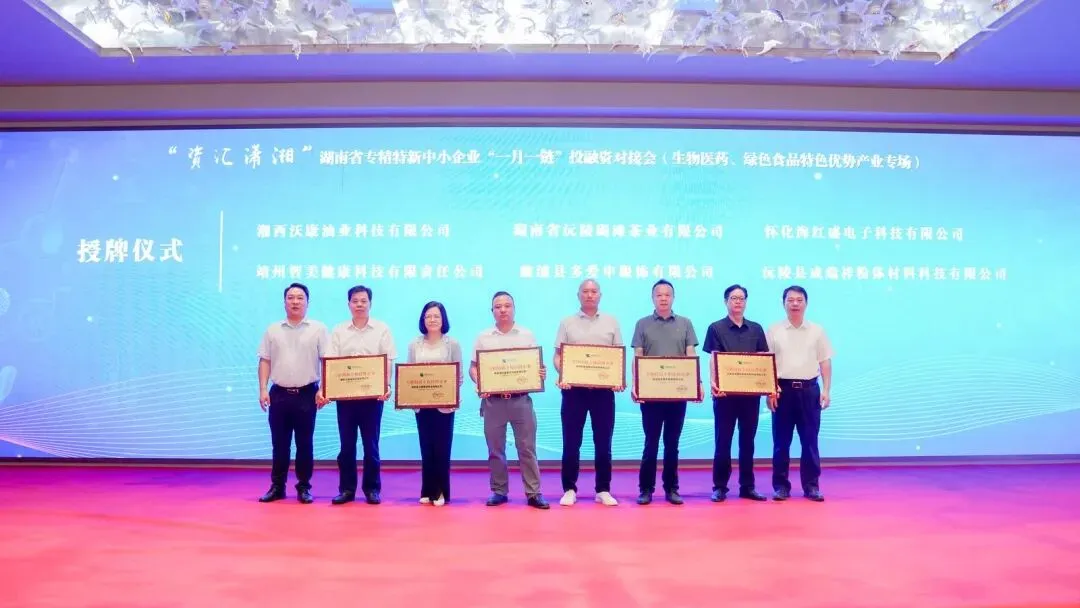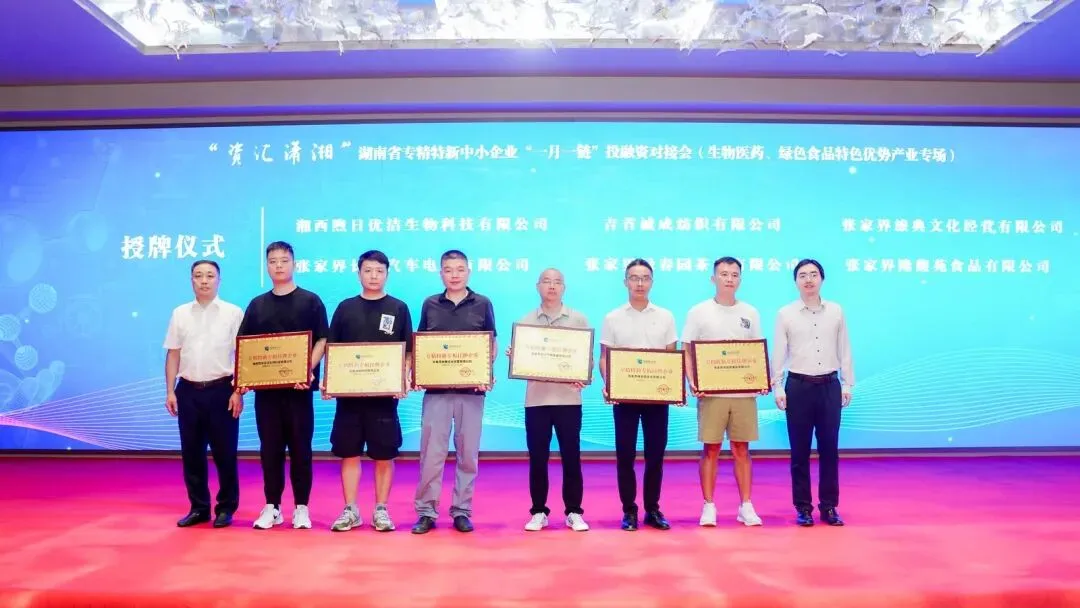 本次会议还印发了《湖南省专精特新中小企业“一月一链”投融资对接会(生物医药、绿色食品等特色优势产业专场) 融资需求手册》,发布融资需求近30亿元。活动现场为湖南省沅陵碣滩茶业有限公司、湘西沃康油业科技有限公司等12家湘西片区专板挂牌企业进行了授牌。
