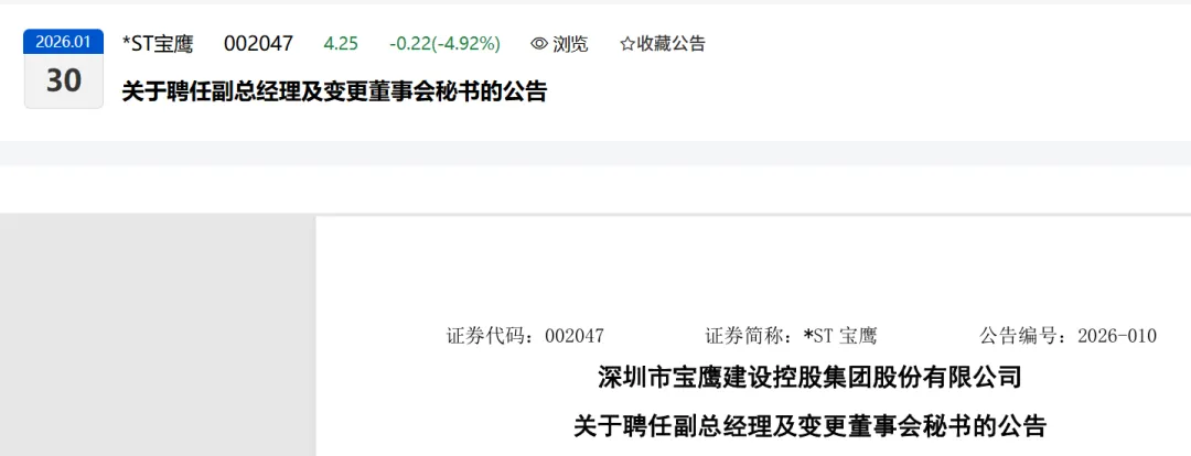 深圳市宝鹰建设控股集团股份有限公司(以下简称“公司”)于2026年1月29日召开了第八届董事会第三十八次会议,审议通过《关于聘任公司副总经理的议案》《关于变更公司董事会秘书的议案》,具体情况如下: