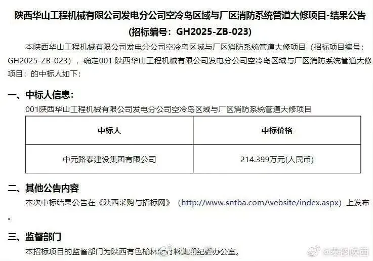 陕西有色榆林新材料集团有限责任公司招标,陕西国辉项目管理有限公司代理,陕西华山工程机械有限公司发电分公司空冷岛区域与厂区消防系统管道大修项目,2025-06-16公告,金额214.399万元,中标人:中元路泰建设集团有限公司。