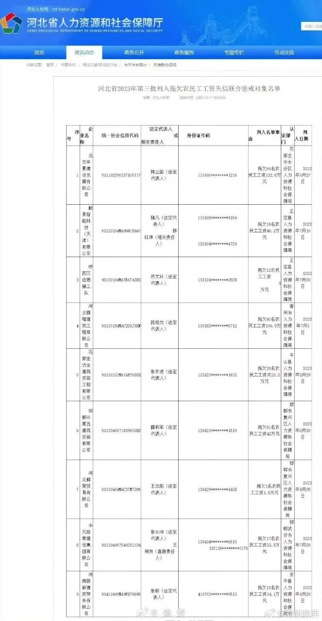 登录“河北省人力资源和社会保障厅”官网查询,2023-10-11《河北省2023年第三批列入拖欠农民工工资失信联合惩戒对象名单》,中元路泰建设集团有限公司拖欠农民工工资,2023年7月28日被列入“黑名单”。