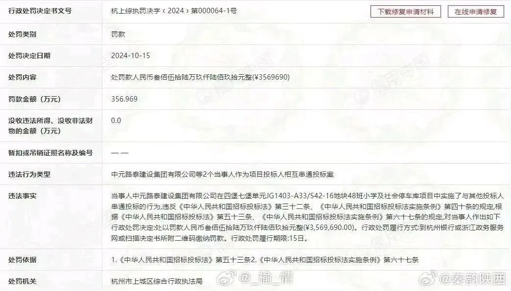 登录“信用中国”查询,杭州市上城区综合行政执法局2024-10-15《行政处罚决定书》杭上综执罚决字【2024】第000064-1号,中元路泰建设集团有限公司串通投标,罚款356.969万元。