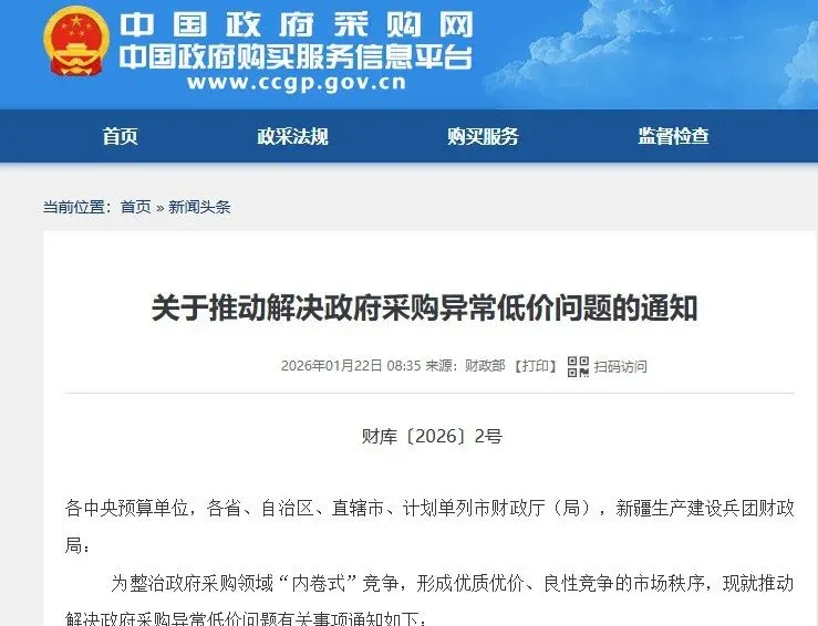 为整治政府采购领域 “内卷式” 竞争,构建优质优价、良性竞争的市场秩序,财政部于 2026 年 1 月 14 日印发《关于推动解决政府采购异常低价问题的通知》(财库〔2026〕2 号),自 2026 年 2 月 1 日起施行,通知面向各中央预算单位及地方各级财政部门等。