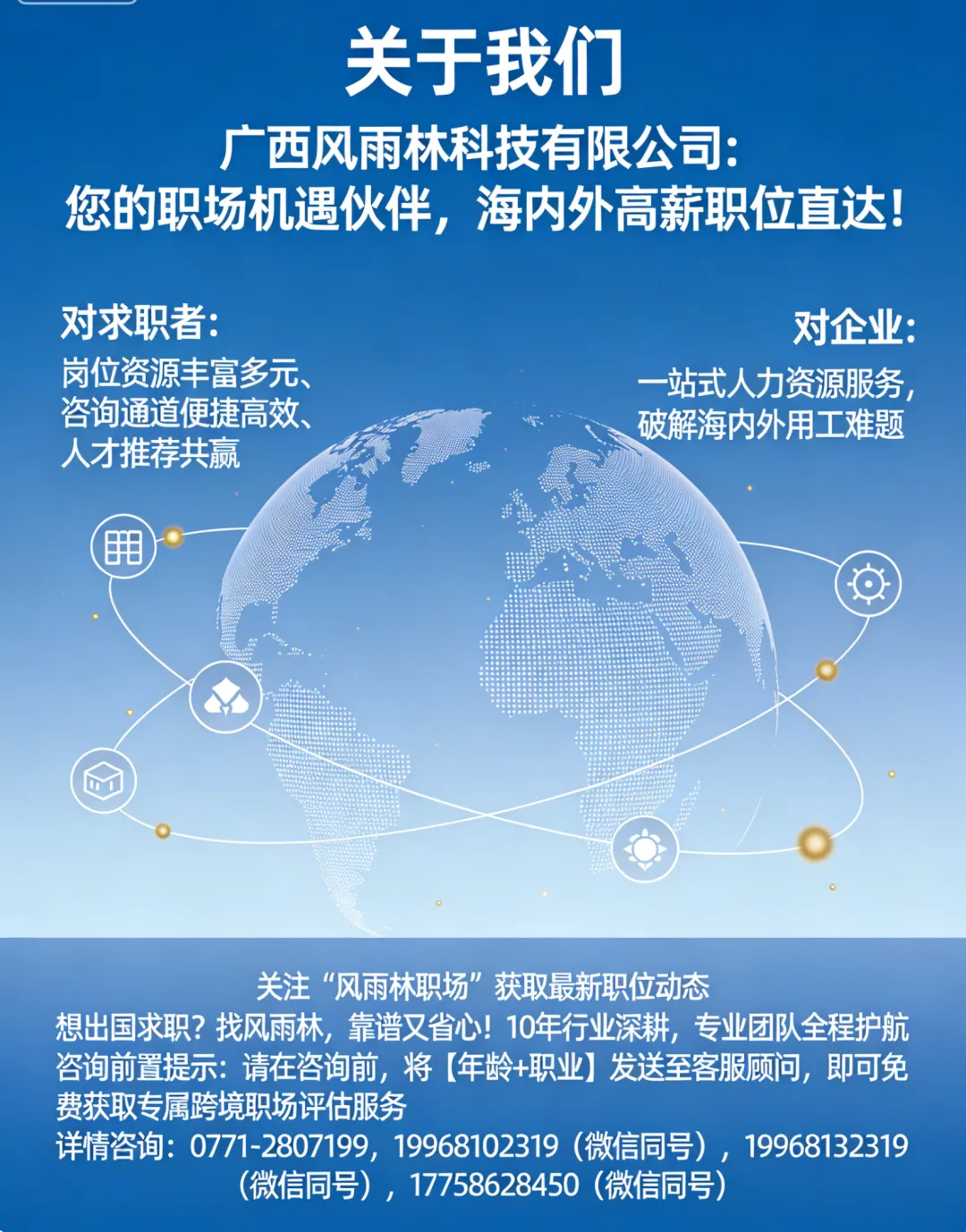 如果您也想出国寻找靠谱的职业出路,不妨选择风雨林职场——10年行业深耕,专业团队全程护航,为您一步安排到位!