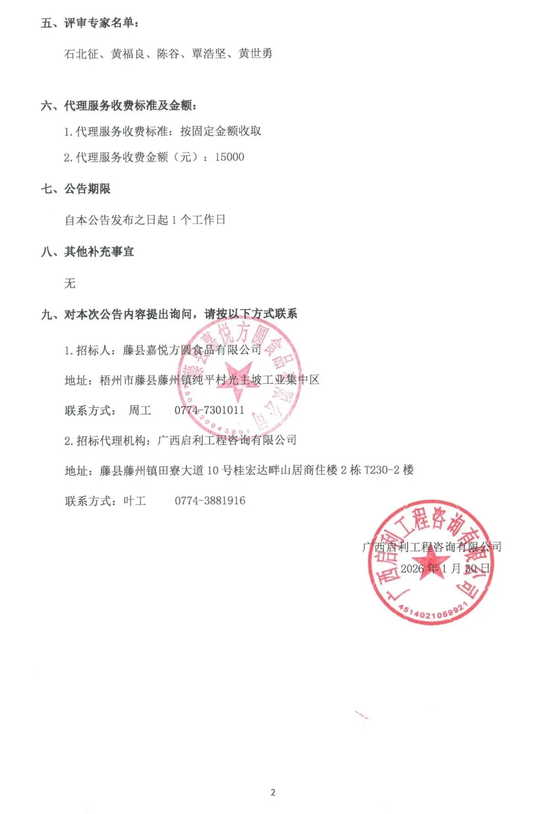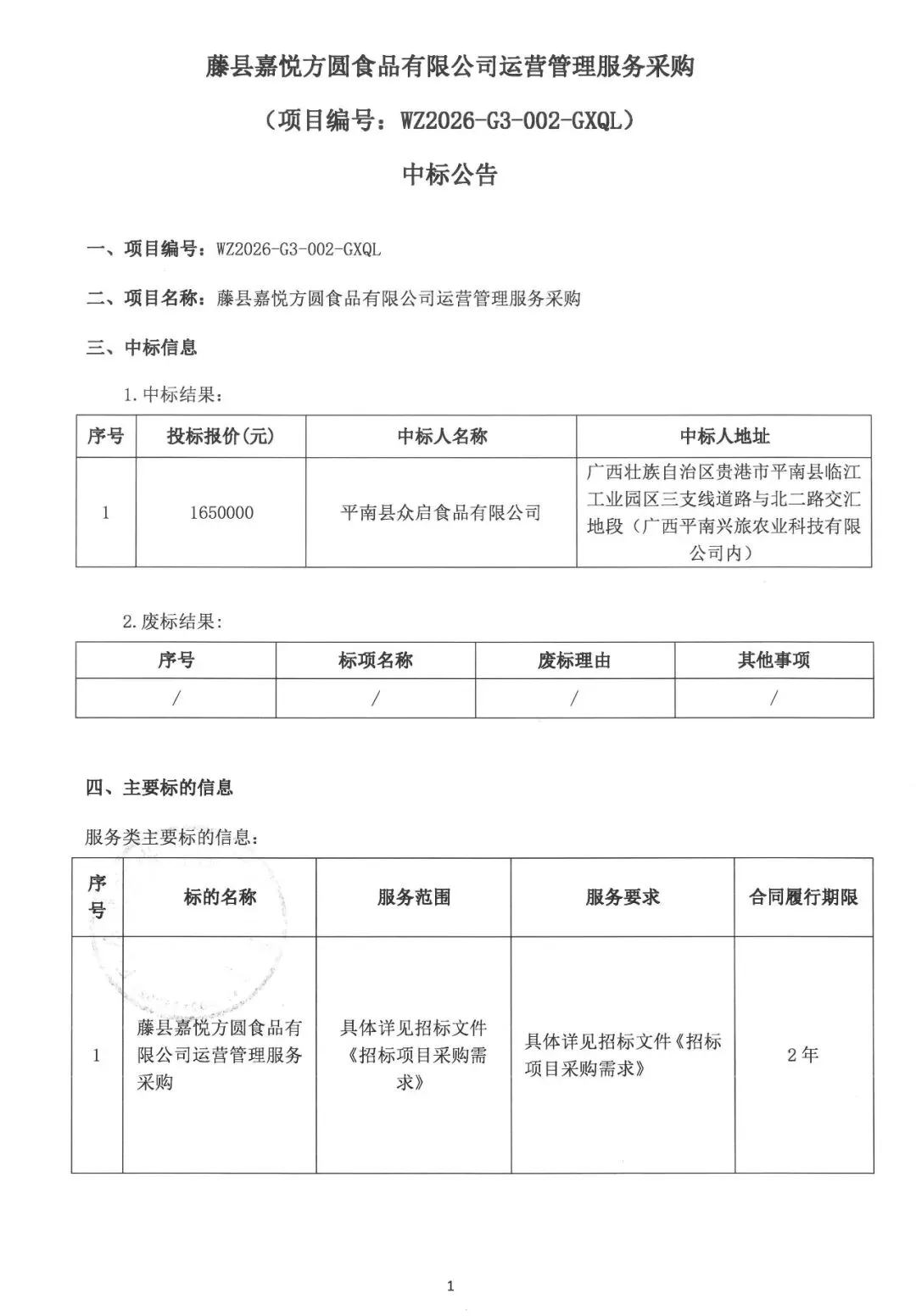 藤县嘉悦方圆食品有限公司运营管理服务采购(项目编号:WZ2026-G3-002-GXQL)中标公告