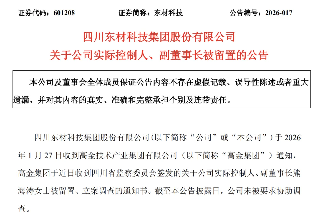 根据东材科技(601208.SH)、高盟新材(300200.SZ)及毅昌科技(002420.SZ)发布的公告,上市公司于1月27日收到高金技术产业集团有限公司通知,获悉公司实际控制人、副董事长熊海涛被留置调查。