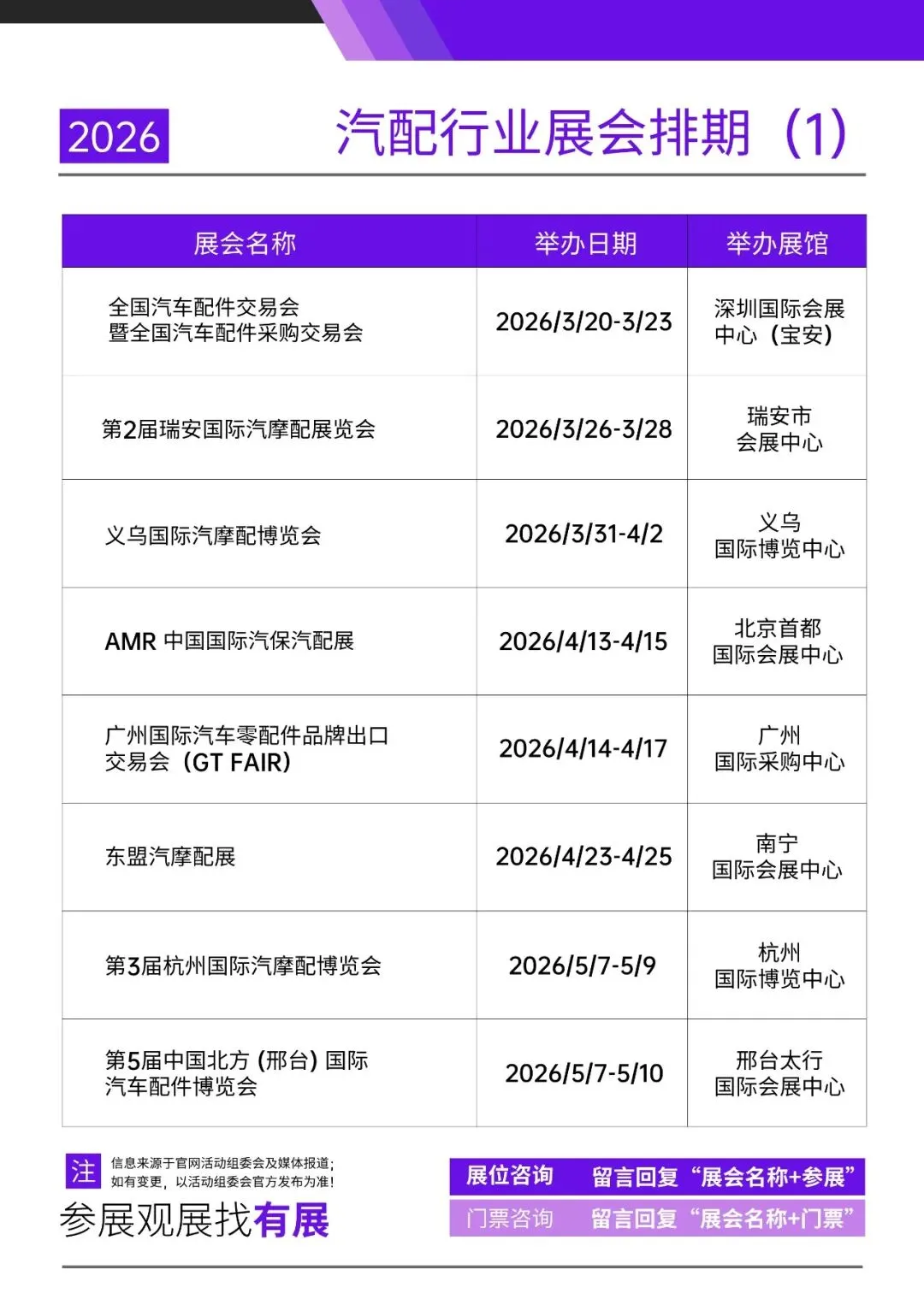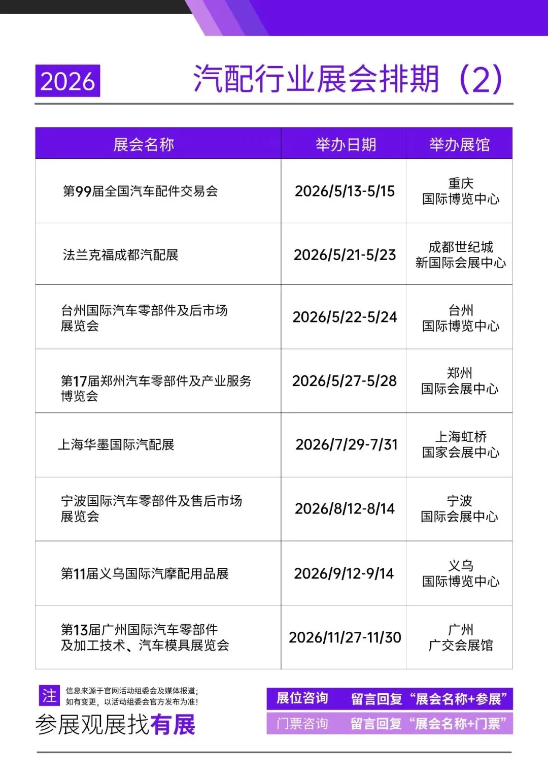 据有展网不完全统计,2026年全国将举办十余场专业汽配相关展会,从核心零部件交易会到汽车用品展,从汽摩配专项展到后市场博览会,再到汽保维修设备展,全品类覆盖、全渠道触达!希望能够为从业者们提供便利,为精准布局展会营销带来实操参考。如需更多详细展会信息或领取免费门票,回复关键词【参展】或【门票】