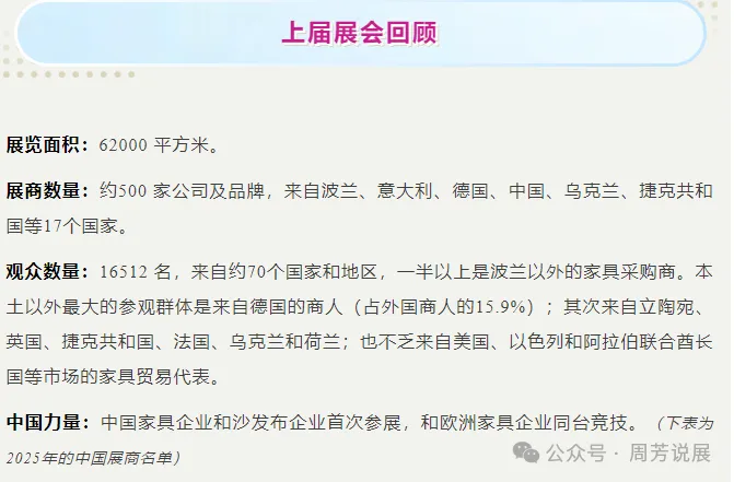 是波兰乃至中东欧地区规模最大的家具展,首办于1982年,每年一届,距今已有40余年的历史。2025年观众来自波兰及以外的约70个国家和地区,使MEBLE成为了名副其实的多元国际化展会。MEBLE POLSKA是向波兰及周边国家市场展示新产品、技术和发展趋势的优秀平台。