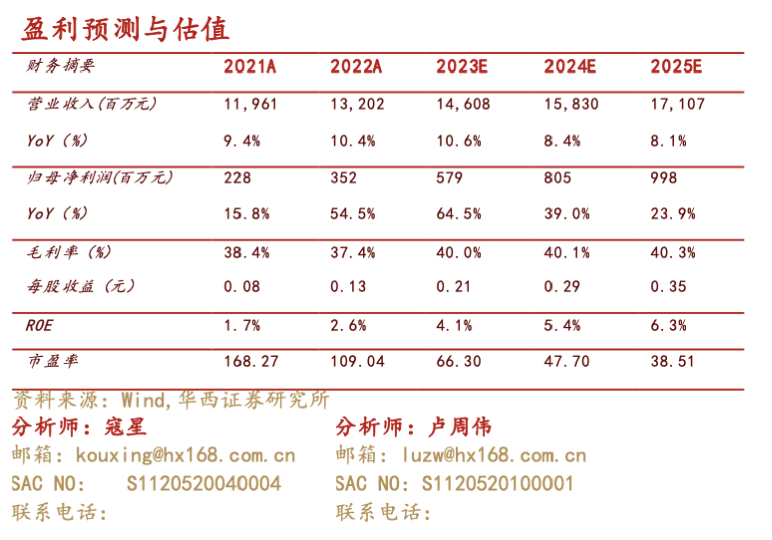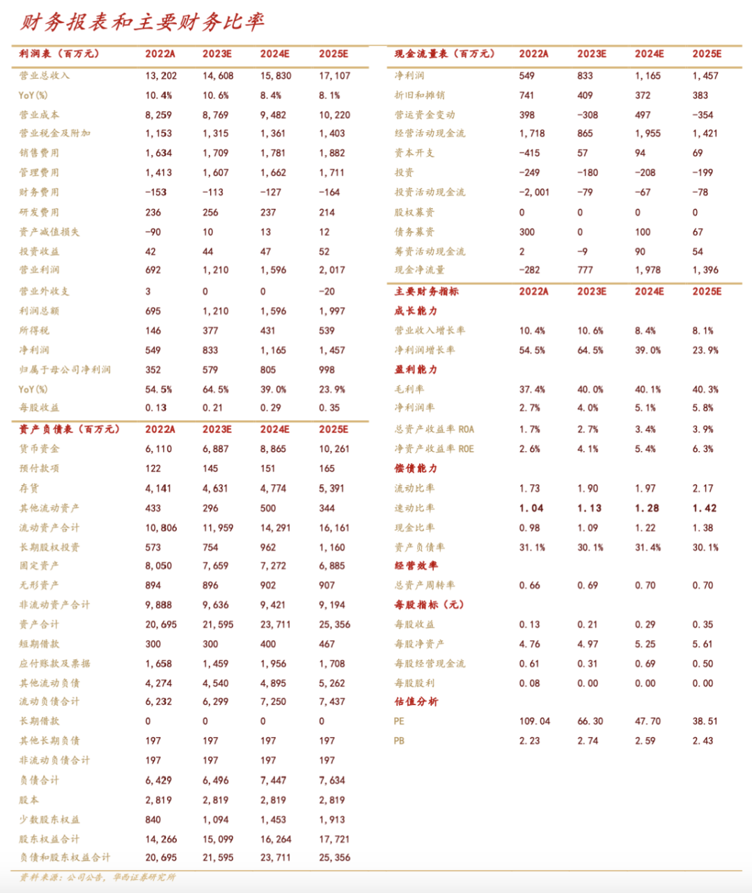 公司2022年毛利率与归母净利率分别为37.4%和2.7%,分别较去年同期-1.0pct和+0.76pct。成本端来看,由于原材料价格大幅上涨,虽然我们认为公司通过招标集中采购等方式对冲成本端压力,但仍受到一定影响。费用端来看,公司销售/管理/财务/研发费用率分别为12.4%/10.7%/1.8%/-1.2%,分别同比去年-0.66/-1.32/+0.04/-0.17pct。我们认为公司销售费用率降低主因公司对销售人员薪酬进行市场化考核,同时加强运营管理,销售效率提升;管理费用率降低主因公司积极推动组织变革,加强对分子公司负责人及经理层成员的管理,实现提质增效。我们预计未来随着原材料成本压力边际改善,公司经营改革进一步推进,公司利润弹性有望进一步得到释放。
