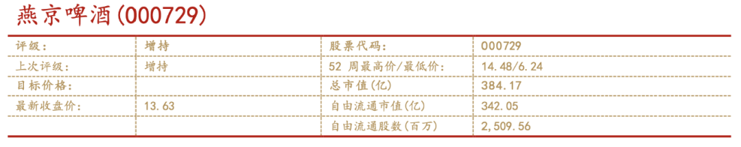 2023年是啤酒行业快速恢复、结构持续升级的一年,也是燕京新任管理层上任后的第一个完整年度。我们认为在啤酒行业疫后复苏的大背景下,燕京有望以高端大单品U8为抓手,持续提升产品结构,同时在管理端继续推行各项改革措施,推动公司高质量发展,实现量价齐升。