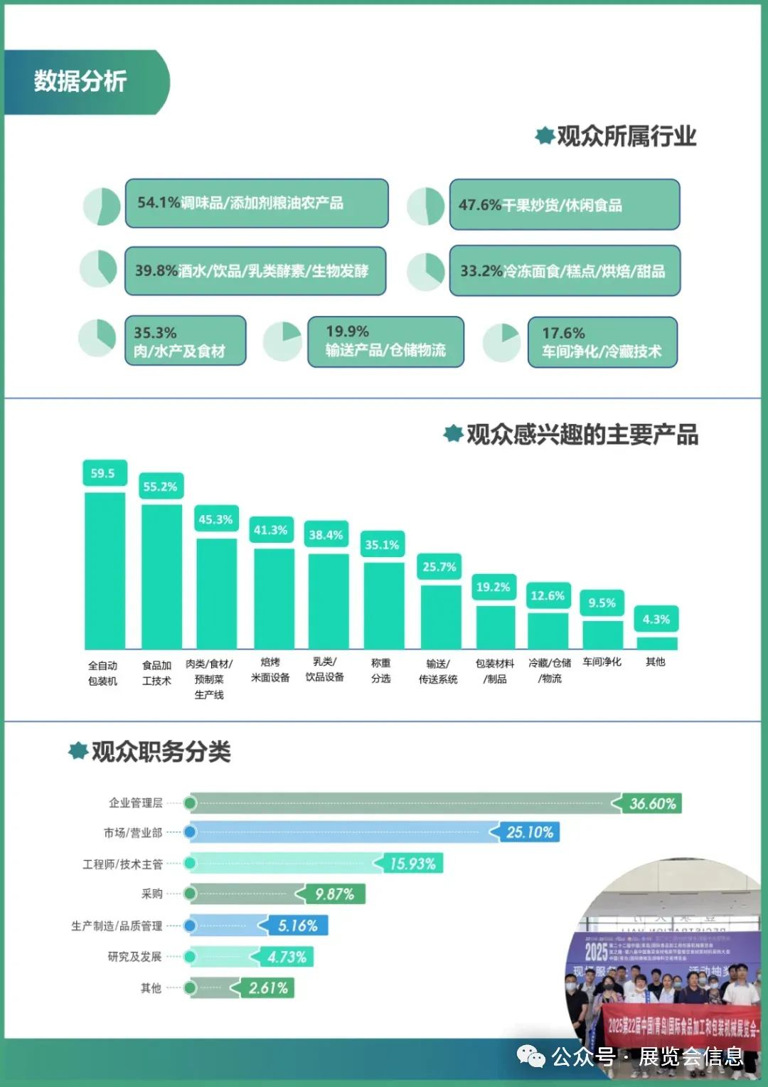 展会构建从食品加工、固态、液体、粉体加工到农产品禽肉水产果蔬米面冻品等产品精加工,从包装耗材、过程包装设备、后道包装设备到智能化装备及仓储物流配送等,涉及行业内建厂到产品出库的一站式加工及包装解决方案。汇聚2500余家国内外知名展商,行业论坛活动20余场,海外采购商对接会10余场,全面展示食品加工与包装机械领域的最新技术成果。重点呈现“无人工厂”解决方案、AI技术应用、高效包装设备、智能仓储物流等前沿领域,推动食品装备行业向高端化、绿色化、集约化升级,为全球食品装备行业搭建高效对接与创新展示平台。