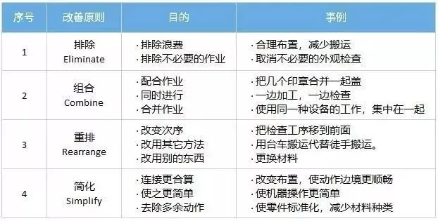 程序分析法(ECRS):整体性制造过程各作业运用剔除、合并、重排与简化使之合理化。
