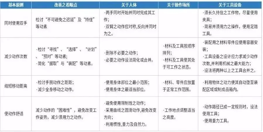 动作分析法:对操作者细微身体动作进行分析,删除其无效动作,提高生产效率
