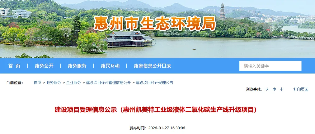 1月27日,惠州凯美特工业级液体二氧化碳生产线升级项目环评受理公示。