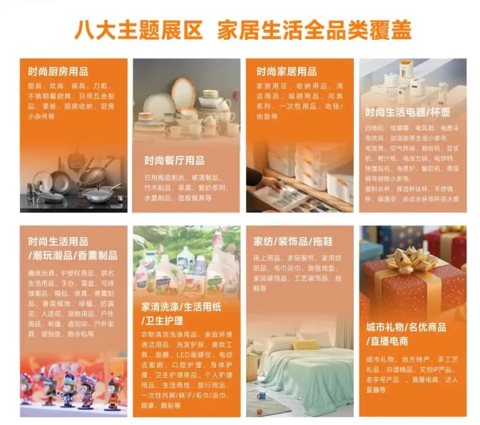 六大主题展区时尚厨房&餐厅用品、时尚生活用品/潮玩潮品/香薰香氛、时尚家居/家纺/装饰品、AI家居·智能家电/时尚杯壶、家清个护/生活用纸、城市礼物/直播电商等相关品牌的品牌企业。整体展出规模10万平方米,汇聚1500+企业,6000+品牌,为行业搭建新品发布、品牌展示、订货交易、互动交流的B2B商贸平台。