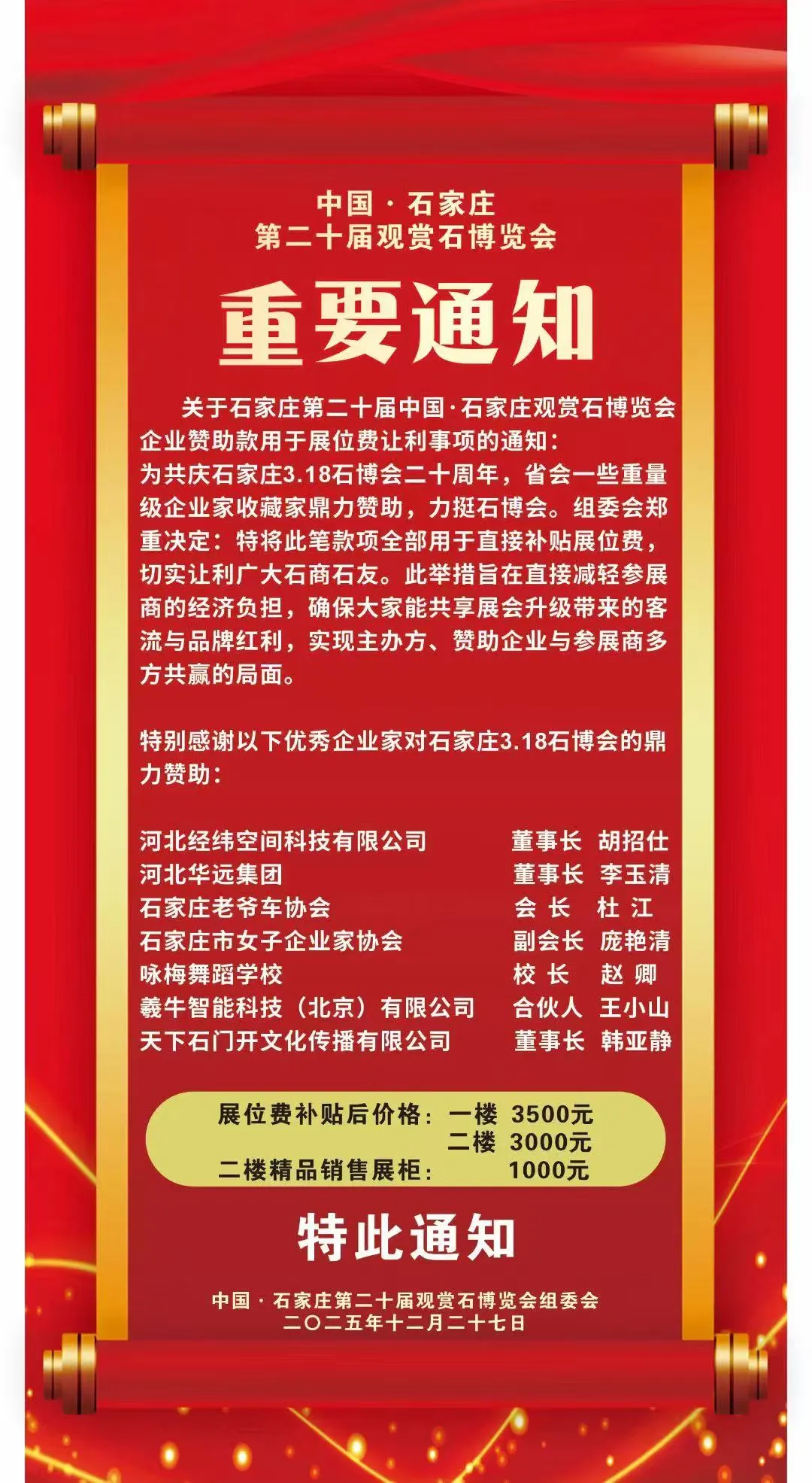 中国观赏石协会、中国收藏家协会、河北省艺术品交流与传播协会等单位联合主办,石家庄市长安区观赏石协会等机构承办的中国·石家庄第二十届观赏石博览会暨二十周年庆典,将于2026年3月18日至3月23日在石家庄国际博览中心隆重举行!作为国内赏石界的标杆性盛会,本届博览会将以“廿载沉淀·三大焕新”为主题,打造一场集展览、交易、拍卖、文化交流于一体的高端赏石盛会。现面向全球公开招商,诚邀各界朋友的加入!