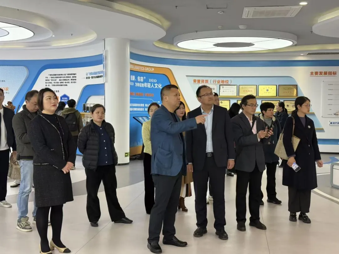 师生一行在广西物流与采购联合会副会长张华的陪同下,实地参观集团规划馆与产业孵化中心,深入了解再生商品供应链、汽车生活业态、环保服务等核心业务板块,并现场观摩广西物流公共信息服务平台的大数据运营演示。企业数字化转型与绿色低碳发展的生动实践,让师生近距离感受到现代物流产业的创新活力。