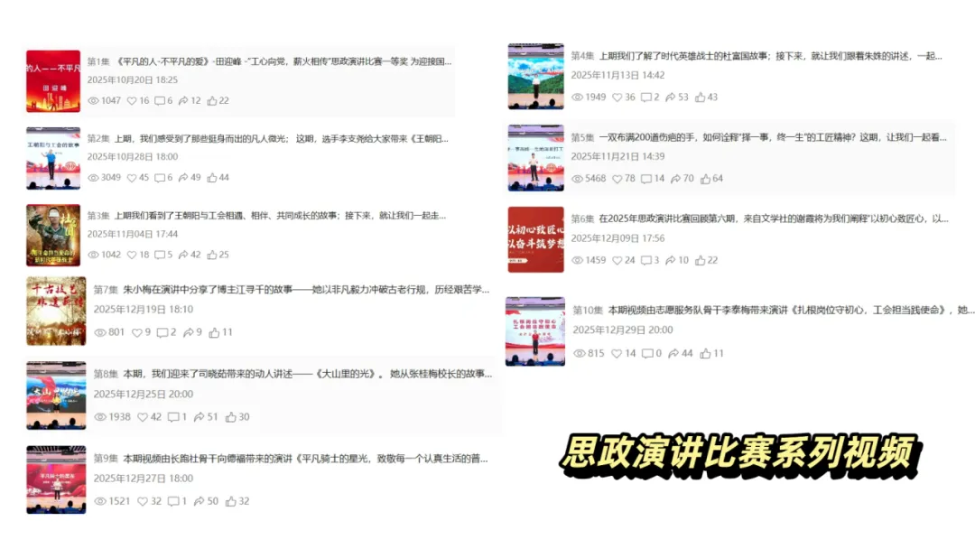 尤其思政演讲比赛,11名职工骨干分享身边故事,现场160人聆听,视频公众号浏览量超1.3万人次,还组建了一线职工宣讲队,让思政教育从“说教”变“分享”,感染力更强。