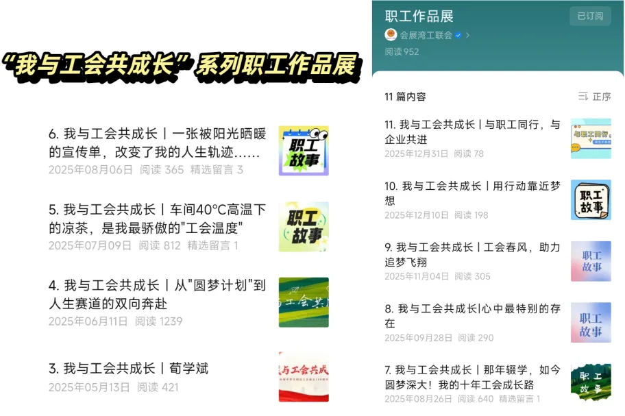 举办 “我与工会共成长” 职工征文比赛,评选9 名职工进行线上专题宣传,在微信公众号推出9 期系列推文,吸引5000多人浏览关注,讲好职工与工会共成长的鲜活故事。
