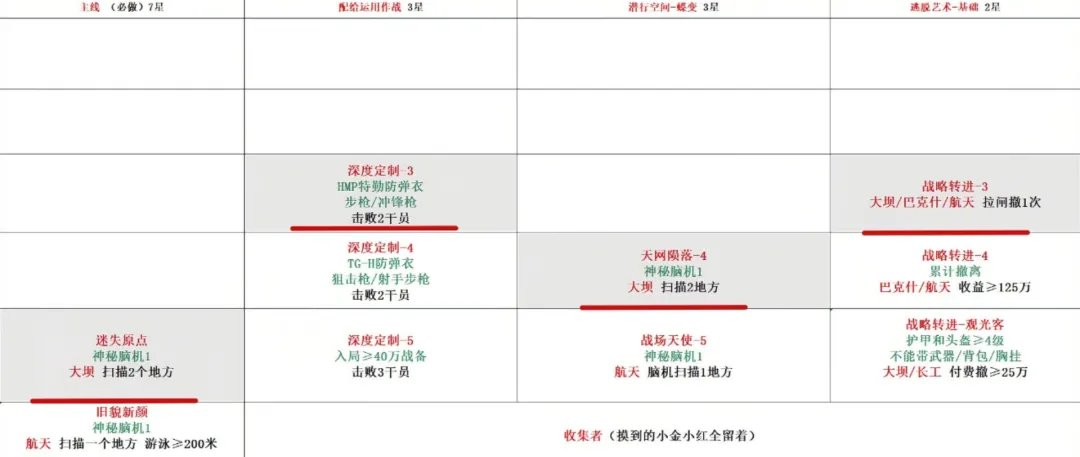 清理完上述任务 你会看到新出现的四个目标 战略转进3暂时搁置 现在需要找一个固定队友或在大厅招募同任务进度的玩家 带上星星书炉和体能训练3所需的六个物品 手持腾龙突击步枪再进大坝 记得脑机 对局内先交换物品 然后主动寻找特殊兵种完成深度定制2 撤离前再扫描一个指定点 体能训练3也随之完成