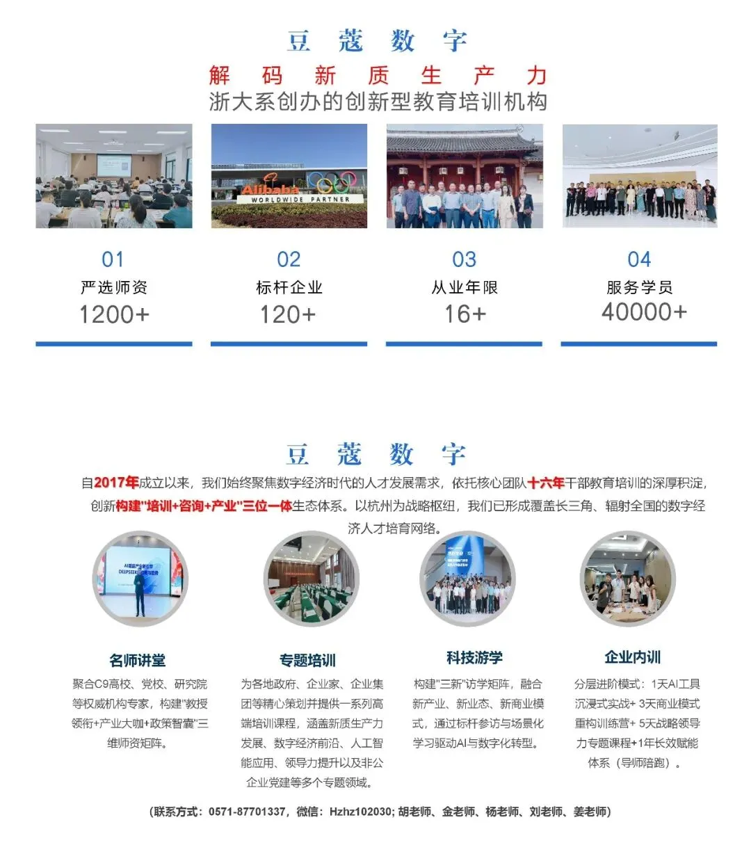 豆蔻数字自2017年成立以来,始终聚焦于新质生产力与人工智能专题培训服务,致力于为全国各地的区县政府、中小民营企业家、头部民企及央国企中基层管理干部提供前沿、实用的知识与专题培训。此次走进百合花集团,对我们而言是一次难得的学习与交流机会。在交流环节,大家围绕新质生产力与人工智能在企业发展中的应用展开了深度探讨。百合花集团作为传统制造业的佼佼者,在新质生产力的培育与发展方面有着丰富的实践经验。陈鹏飞副董事长分享了集团如何通过技术创新、管理创新等手段,提升生产效率、优化产品质量,实现传统产业的转型升级。同时,他也对人工智能在企业生产、管理、营销等环节的应用前景表示了浓厚兴趣,并期待与各位学员共同探索合作机会。此次跨界交流活动在热烈而融洽的氛围中圆满结束。大家纷纷表示,通过此次活动,不仅增进了彼此之间的了解与友谊,更为未来的紧密学习与合作奠定了坚实基础。豆蔻数字也将以此次活动为契机,继续深耕新质生产力与人工智能培训领域,为更多企业提供优质服务,共同推动行业进步与发展。“杭商学堂”是由杭州市委组织部主办、协同市经信局、科技局等多部门创设,市人才专项资金保障的杭州企业经营管理人才培训平台。是杭州重点打造的民营企业家培育工程。于2013年正式成立,其前身是2004年实施“356”工程。“杭商学堂”按照“政治上有方向、经营上有本事、责任上有担当、文化上有内涵”的教育方针。“杭商学堂”紧密围绕杭州产业发展实际和企业家需求,开设规模班、成长班、初创班、数字经济班、人工智能班、战略性新兴产业班、科技金融班等多个培训班次,邀请学界、政界、业界优秀师资授课,开办20年来,累计培训企业家8000余人次。