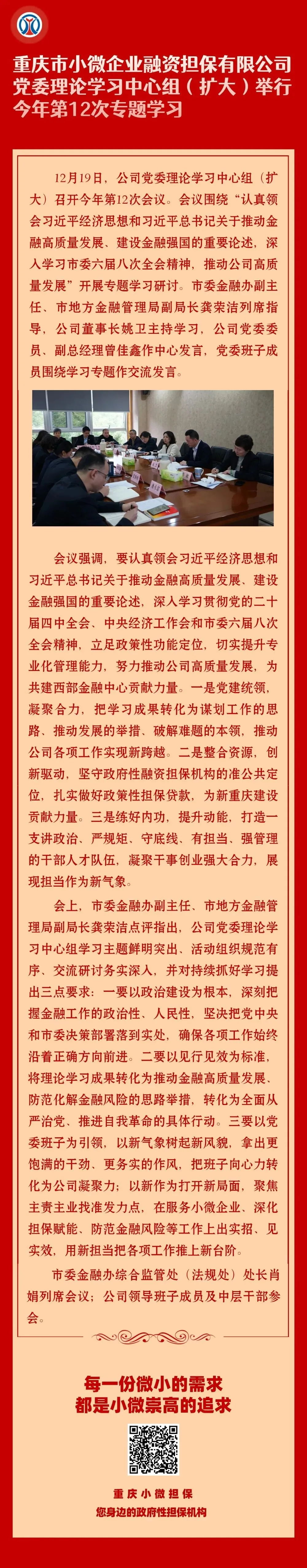 重庆市小微企业融资担保有限公司党委理论学习中心组(扩大)举行今年第12次专题学习