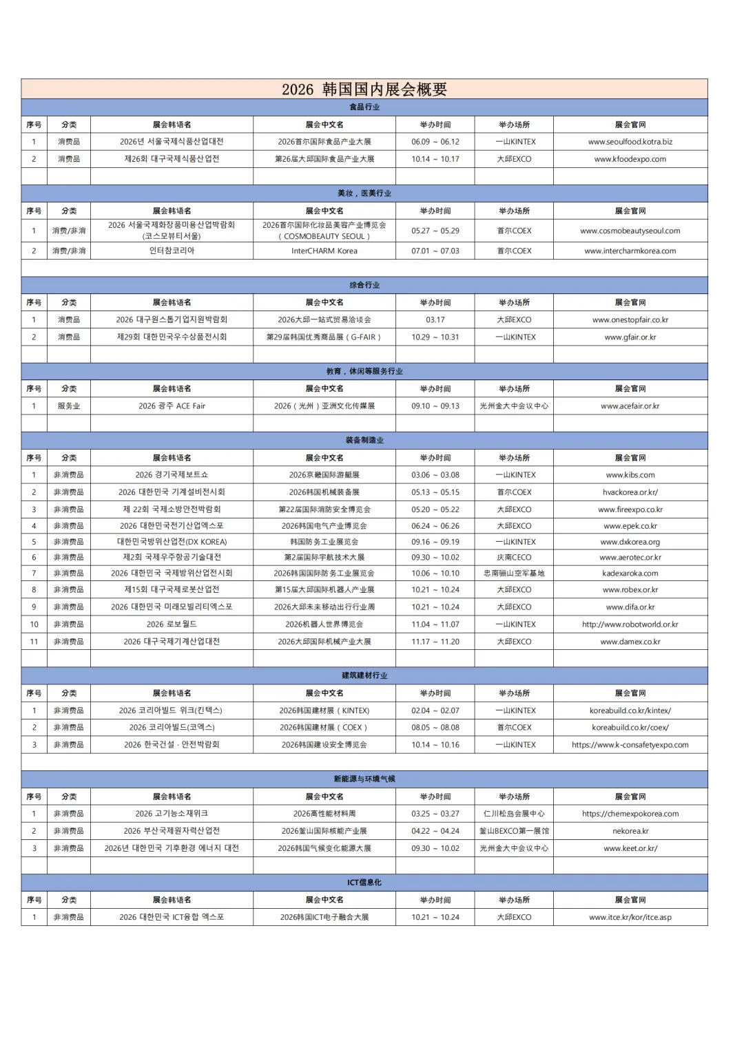 为满足企业拓展韩国市场需求,市贸促会整理了2026年韩国重点展会及洽谈会清单,涵盖食品、美妆医美、装备制造、建筑建材、新能源、ICT信息化等8大行业领域,共30余场重点展会及贸易洽谈会信息(点击下载)。